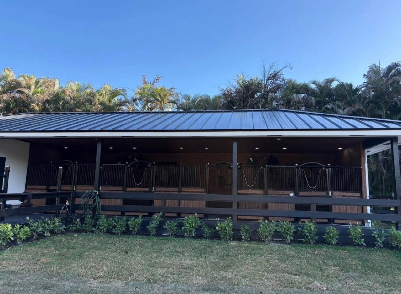 New build 4 stall barn with new water features, Large tack room, Saratoga stalls. Access to covered riding arena, Grass field to hack in. Grassy Paddocks.