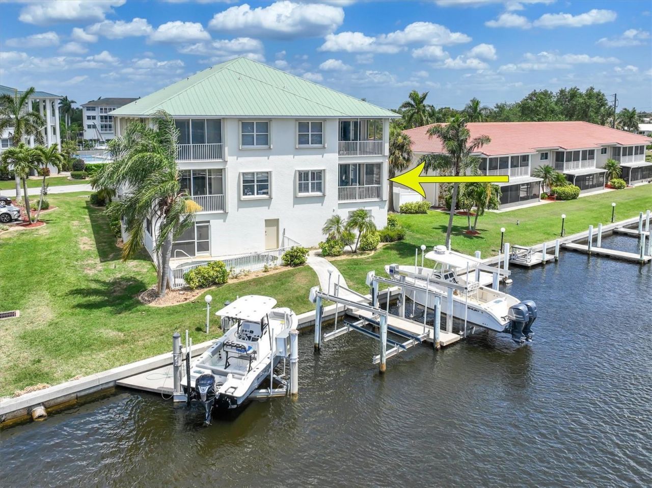 Dock Your Dreams Here! Tired of evaluating possible condo life that feels like living in a glorified shoebox or one of those 'tiny houses seen on TV? Then it is time to 'say hello to Unit 121 at 129 Breakers Court 'A sprawling 2,383 sq ft, 3- bedroom, 2-bath waterfront escape in the ultra-premium Punta Gorda Isles (PGI), that laughs in the face of 'tiny living. This isn't just a condo; it's your personal ticket to Florida done right. Review your personal wish list for a condo in Florida; Sailboa...Dock Your Dreams Here! Tired of evaluating possible condo life that feels like living in a glorified shoebox or one of those 'tiny houses seen on TV? Then it is time to 'say hello to Unit 121 at 129 Breakers Court 'A sprawling 2,383 sq ft, 3- bedroom, 2-bath waterfront escape in the ultra-premium Punta Gorda Isles (PGI), that laughs in the face of 'tiny living. This isn't just a condo; it's your personal ticket to Florida done right. Review your personal wish list for a condo in Florida; Sailboat access location (no- bridges) in seconds to Charlotte Harbor, plus deeded dock with a 10,000-pound boat lift waiting for your vessel like an eager puppy. Fish right off your own dock? CHECK! Wake up to views over Bass Inlet and out to Charlotte Harbor, plus enjoy the daily parade of boats going out and returning? Double CHECK !!. A Corner Residence in a 4 Unit Boutique Complex with immediate membership of 25% on the Board? CHECK, CHECK, CHECK !!! This is not a massive, cookie-cutter complex where you're just another number and decisions are made by people you never see. Here, you enjoy true influence and real control over your home environment. With only four condos in the entire building, you're part of an exclusive, boutique-style community - one where 'your voice matters and your lifestyle truly comes first. Step inside this freshly remodeled (2023 glow-up alert!) open-concept beauty: towering tray ceilings (nearly 10 feet high) and 8-foot doors make you feel like royalty, not cramped. The large format 24 x 48 white porcelain tiles glisten though out. The massive master suite alone clocks in over 500 sq ft - complete with a cozy love seat reading nook for those I just need five minutes away from everyone moments - plus walk-in closets in every bedroom. The chef's kitchen boasts updated soft-close cabinets, under-counter lighting, glass tile backsplash, reverse osmosis filtration, and a breakfast bar big enough for your entire crew. Dual sliders open to a generous 155 sq ft screened lanai - perfect for sunset sips while watching the boats go by or simply pondering the nuances. No more wrestling with parking or weather (hot, cold or wet) - enjoy an enclosed, weather-protected under-building garage with two deeded spots (plus additional room for bikes, golf cart, or that kayak), your own secure storage room, plus extra-large humidity-controlled community gear locker for boating and fishing equipment / toys (will bet you have not seen this anywhere else). The building's pool overlooks Bass Inlet with a screened gathering spot; a new metal roof (2023) for lower insurance; and a steady $785 HOA (since 2022) that covers everything from flood insurance to trash, pool, elevator, and pest control - basically, they handle the boring stuff so you can focus on the fun. Location? Palm-lined cul-de-sac bliss ending at Brown Park, walking/biking distance to Fisherman's Village restaurants and shops, Isles Yacht Club, Gilchrist Park (tennis & pickleball), and just across from the new Sunseeker Resort. Ideal for full-time living or lock-and-leave snowbird vibes - come and go as you please. This corner-unit stunner is move-in ready, modern, upscale, and unapologetically boater-friendly. Why settle for good enough when you can have Holy Mackerel, this is paradise CHECK, CHECK, CHECK, CHECK!!!! Your waterfront adventure awaits. Don't let this one sail away!