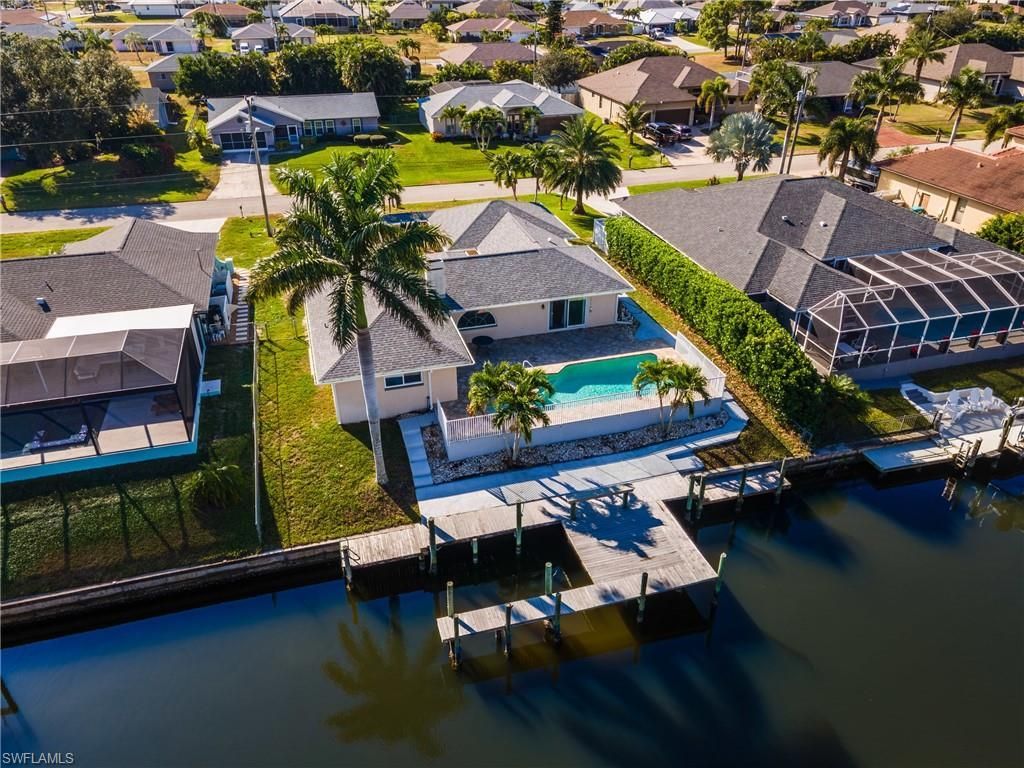 This Gulf access, 3 bedroom, 2 bath pool home is located in the SW Cape with just 1 bridge to open water in 25 minutes! NOT in a flood zone. No damages from Ian. New roof and gutters in 2020, impact sliders and windows, new water heater 2025. Swim and relax in the pool and spa, fish off of the large dock! New attic insulation. Assessments paid. Large living room with fireplace. The house is prewired for Quantum Fiber and ADT security. Oversized two car garage, large laundry room.