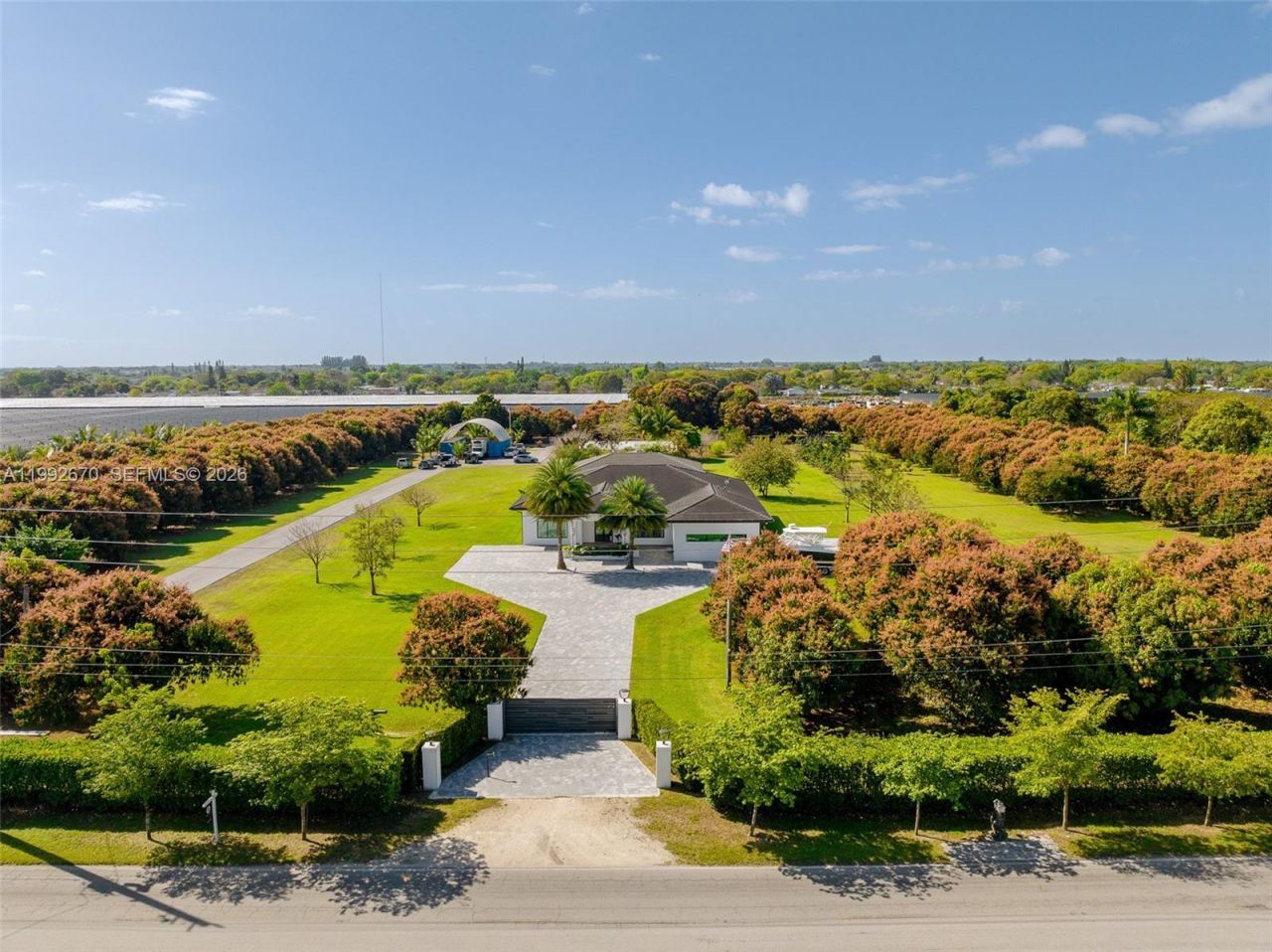 Welcome to Hacienda Moderna - a rare offering that blends 21st-century luxury with expansive countryside living. Set on 7.5 acres, this exceptional estate features an income-producing mango grove with over 300 trees, complemented by a diverse collection of fruit trees including avocado, mamey, lime, tamarind, soursop, sugar apple, plum, banana, & coconut. Here, you can truly disconnect & immerse yourself in the beauty & tranquility of nature. At the heart of the property lies a stunning contempo...Welcome to Hacienda Moderna - a rare offering that blends 21st-century luxury with expansive countryside living. Set on 7.5 acres, this exceptional estate features an income-producing mango grove with over 300 trees, complemented by a diverse collection of fruit trees including avocado, mamey, lime, tamarind, soursop, sugar apple, plum, banana, & coconut. Here, you can truly disconnect & immerse yourself in the beauty & tranquility of nature. At the heart of the property lies a stunning contemporary one-story home built in 2021. With 4 bedrooms & 5 full baths, the home offers an ideal floor plan w/ formal living & dining rms, spacious open-concept family rm, luxurious private master suite, & state-of-the-art kitchen. Additional highlights include high ceilings, elegant porcelain tile flooring, full impact windows/doors & 2-car garage. Designed for exceptional outdoor living & entertaining, the property features a large pool & jacuzzi + an impressive 2,400 sq ft covered terrace w/ summer kitchen including grill, burner, refrigerator, icemaker, dishwasher, & cabana bath. The estate is fully secured, accessed through electric gates that open to a long brick driveway & porte-cochère + separate service entrance. The expansive grounds offer endless opportunities for agricultural, farming, or landscaping pursuits. Ideally located just west of Krome Avenue, Hacienda Moderna offers convenient access to local nurseries, fruit stands, and the best of South Miami-Dade attractions.