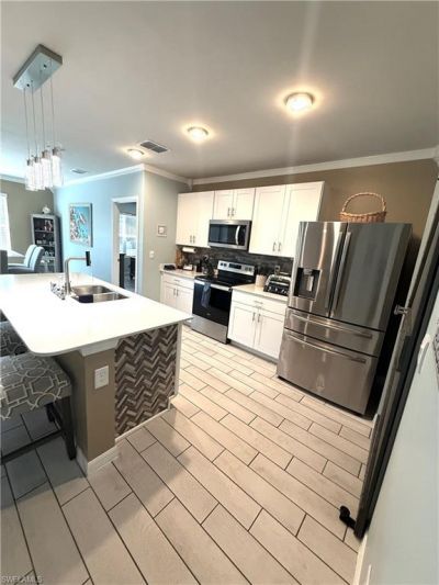 Located within the Magnolia Landing community, this residence reflects extensive upgrades and enhancements inside and out, offering a level of finish and functionality beyond standard builder features.The home showcases engineered waterproof, scratch-resistant flooring throughout the bedrooms, crown molding in the main living areas and hallway, updated interior paint, chair rail detailing, and upgraded lighting and ceiling fans throughout. The kitchen includes added backsplash detailing, upgrade...Located within the Magnolia Landing community, this residence reflects extensive upgrades and enhancements inside and out, offering a level of finish and functionality beyond standard builder features.The home showcases engineered waterproof, scratch-resistant flooring throughout the bedrooms, crown molding in the main living areas and hallway, updated interior paint, chair rail detailing, and upgraded lighting and ceiling fans throughout. The kitchen includes added backsplash detailing, upgraded faucet, sliding barn pantry door, and enhanced finishes for everyday use and entertaining. Bathrooms have been improved with a tiled primary shower floor, sliding glass shower door, and updated fixtures.Outdoor and exterior improvements are a defining feature of the property. The fully fenced backyard includes multiple gates, established landscaping for added privacy, custom concrete curbing, landscape rock beds, lighting, and decorative plantings including palm features. The screened lanai area has been expanded and enhanced with two access doors, dog access, ceiling fan, manual awning, outdoor TV, and a water feature. A decorative paver patio provides additional outdoor living space.Garage upgrades include a custom epoxy floor, extended paver driveway, generator hookup with transfer switch, mini-split air conditioning, upgraded lighting, attic access, exterior service door, and screened garage entry. Gutters and exterior lighting enhancements have also been added.Additional improvements include upgraded appliances, irrigation system enhancements, ADT security system with smart switches, and multiple functional and aesthetic upgrades throughout.Magnolia Landing offers optional golf membership and a range of amenities including pools, pickleball, bocce ball, shuffleboard, and community events. Convenient access to shopping, dining, and major roadways supports both seasonal and full-time living.