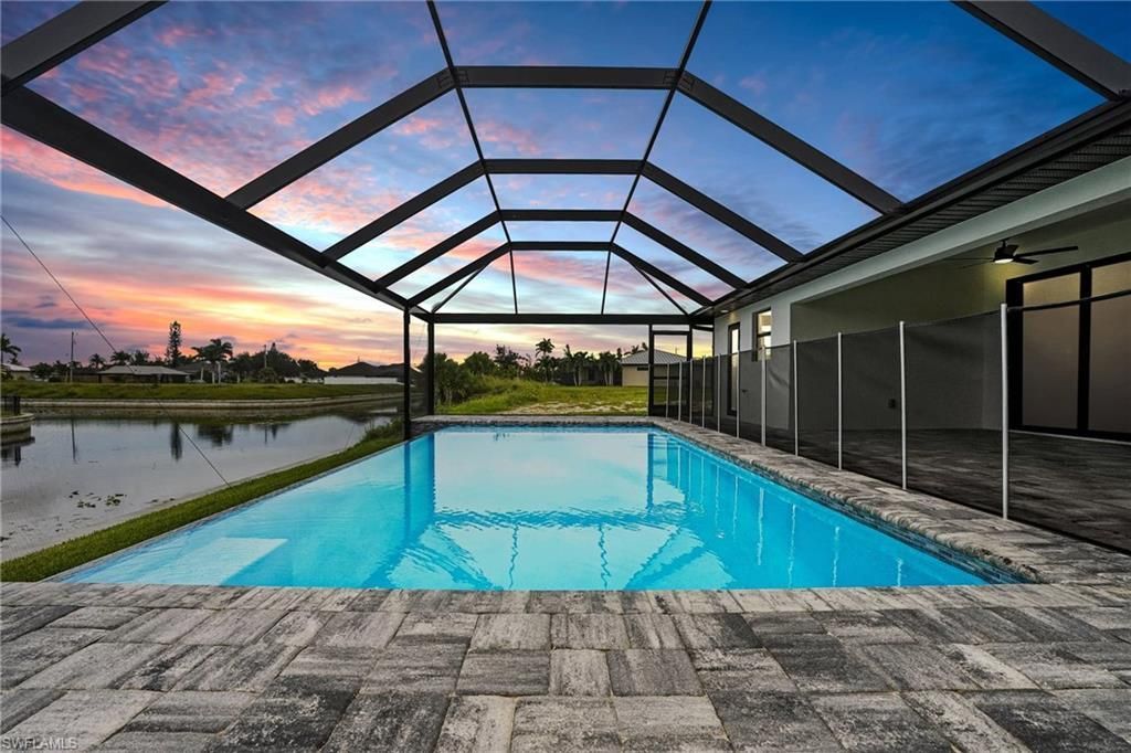 Welcome to your dream home on the Corsaire Canal! This brand-new 4 bedroom + Den, 3 full bathroom pool home is designed for both luxury and functionality. The versatile floor plan includes a private in-law suite with its own entry and full bath that also serves as the pool bath, creating the perfect setup for guests or multi-generational living. Inside, the open-concept layout features a gourmet kitchen with a huge waterfall-edge island, luxury appliances, and custom cabinetry, seamlessly flowin...Welcome to your dream home on the Corsaire Canal! This brand-new 4 bedroom + Den, 3 full bathroom pool home is designed for both luxury and functionality. The versatile floor plan includes a private in-law suite with its own entry and full bath that also serves as the pool bath, creating the perfect setup for guests or multi-generational living. Inside, the open-concept layout features a gourmet kitchen with a huge waterfall-edge island, luxury appliances, and custom cabinetry, seamlessly flowing into the spacious living and dining areas overlooking the water. Elegant crack prevention tile flooring runs throughout the home, ensuring long term beauty and durability. Step outside to your private lanai and sparkling infinity salt water pool where you can relax and enjoy the tranquil canal views. Built with impact-resistant windows and doors, this home also offers a paver driveway with extended parking spaces, a two-car garage, and thoughtful designer finishes throughout. With energy-efficient construction and modern elegance in every detail, this home blends style, comfort, and the best of the Southwest Florida lifestyle. No HOA, No Flood Insurance, No Drama! All Assessments in and paid.
