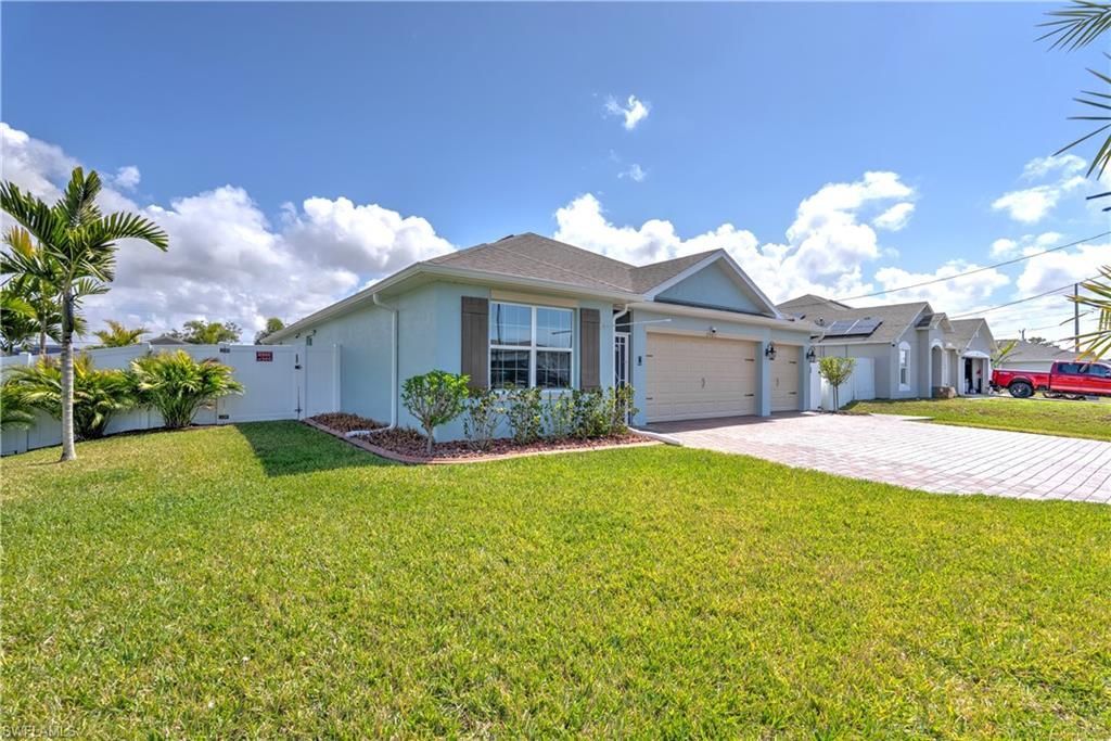 Better than new and truly move-in ready, this beautifully upgraded Madison model was built just three years ago and offers 4 bedrooms, 3 full bathrooms, a 3-car garage, and 2,020 square feet of well-designed single-story living in desirable Northwest Cape Coral. The open-concept floor plan features durable tile throughout the main living areas and upgraded carpet in the bedrooms. The spacious kitchen overlooks the living and dining areas and serves as the heart of the home, showcasing stainless ...Better than new and truly move-in ready, this beautifully upgraded Madison model was built just three years ago and offers 4 bedrooms, 3 full bathrooms, a 3-car garage, and 2,020 square feet of well-designed single-story living in desirable Northwest Cape Coral. The open-concept floor plan features durable tile throughout the main living areas and upgraded carpet in the bedrooms. The spacious kitchen overlooks the living and dining areas and serves as the heart of the home, showcasing stainless steel appliances including an LG French-door refrigerator, ample cabinetry, a large pantry, generous quartz counter space, backsplash, and a farmhouse sink. All bathrooms feature custom-tiled shower walls and stylish upgraded light fixtures with cabinets. The private primary suite includes a spacious bedroom, walk-in closet, and en-suite bath with dual sinks and a glass-enclosed walk-in shower. Three additional bedrooms provide flexibility for guests, a home office, or a separate en-suite, with two full bathrooms offering added convenience. Additional features and upgrades include epoxy-coated garage floors, insulated garage doors, extra attic insulation, extended pavers in the driveway, lanai and along one side of the home, as well as an under-truss screened lanai with privacy shades. The home also offers a wireless Eufy security camera system, screened front entry, automated irrigation system, upgraded Floratam sod, professionally landscaped with trees, shrubs and curbing, gutters around the entire home, and a vinyl privacy fence-ideal for kids or pets. A 7x10 Superior Shed provides additional storage. Interior conveniences include a top-of-the-line whole-home reverse osmosis system, an indoor laundry room with Samsung front-load washer and dryer, remote-controlled ceiling fans in all bedrooms and on the lanai, and a remote-controlled AC system unit with additional ceiling lighting in the garage.Enjoy year-round Florida living in an oasis backyard space perfect for relaxing or entertaining. Conveniently located in a growing neighborhood with easy access to shopping, dining, schools, and major roadways. And best of all, this property is not in a flood zone, so flood insurance is optional. This is a rare opportunity to own a thoughtfully upgraded home-schedule your private showing today.