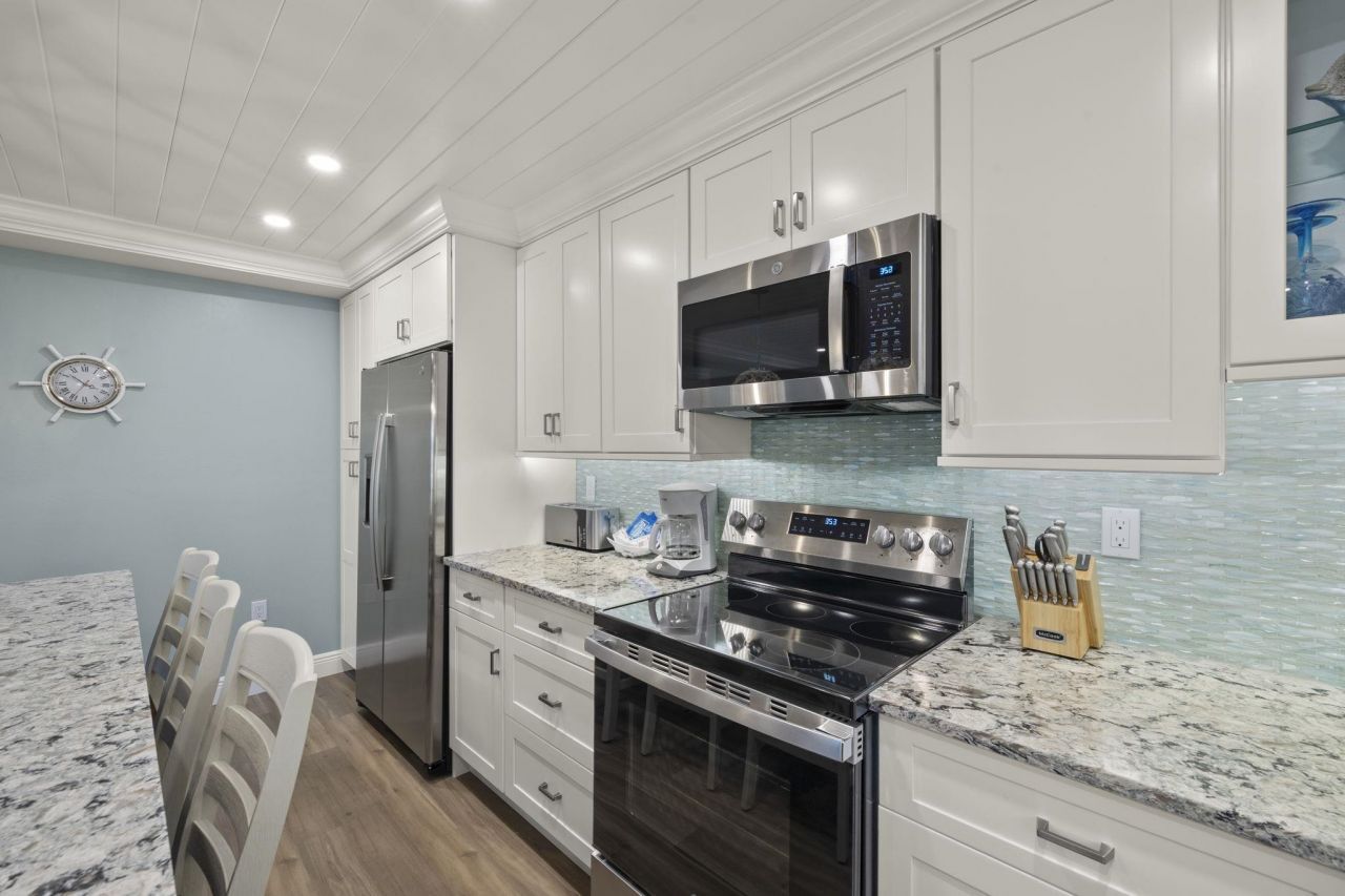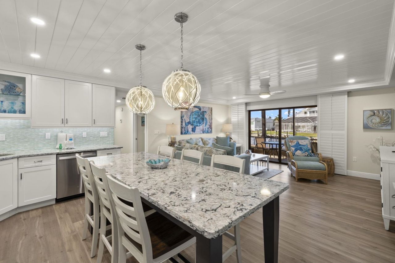 Discover the epitome of island elegance in this exquisitely reimagined residence within the highly sought-after Gulf and canal front enclave of Sanibel Moorings, perfectly situated along the pristine East End of Sanibel Island. Every detail of this remarkable unit has been thoughtfully curated, creating a seamless blend of modern refinement and coastal tranquility. From the moment you enter, sunlight dances across rich wood-plank LVT floors, guiding you through a space that feels as luxurious as...Discover the epitome of island elegance in this exquisitely reimagined residence within the highly sought-after Gulf and canal front enclave of Sanibel Moorings, perfectly situated along the pristine East End of Sanibel Island. Every detail of this remarkable unit has been thoughtfully curated, creating a seamless blend of modern refinement and coastal tranquility. From the moment you enter, sunlight dances across rich wood-plank LVT floors, guiding you through a space that feels as luxurious as it is livable. The gourmet kitchen is a designer's dream?an artful composition of custom cabinetry, Cambria quartz countertops, and state-of-the-art stainless steel appliances. A grand center island invites effortless entertaining, while the tongue-and-groove wood ceiling and pendant lighting add a touch of architectural drama to this open, inviting space. The spacious living room exudes sophistication, adorned with crown moldings, tasteful designer furnishings, and a sleek 75-inch television?perfect for relaxed evenings after a day at the beach. Both bathrooms are masterfully transformed, featuring bespoke cabinetry, wood-inlaid accent niches, and exquisite tilework that evoke a spa-like serenity. The primary suite is a true retreat, boasting a grandfathered washer and dryer hookup?a rare and coveted amenity within Sanibel Moorings. Step through impact-rated sliders framed by plantation shutters to your private screened lanai, where tranquil canal views and tropical breezes create the perfect backdrop for morning coffee or sunset cocktails. Beyond your door, Sanibel Moorings offers an incomparable lifestyle?lushly landscaped grounds, a sparkling community pool, inviting grills for alfresco dining, and direct access to the sugar-sand beaches of the Gulf of Mexico. The property's unique dual waterfront setting?with both Gulf frontage and a navigable canal?captures the very essence of island living. This is more than a residence?it's an invitation to embrace the art of coastal luxury.